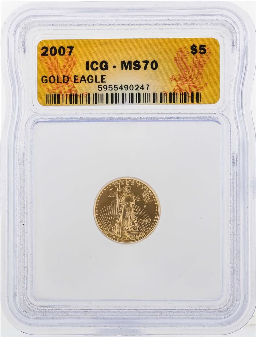One 2007 $5 American Gold Eagle Coin ICG MS70. ICG Certified.