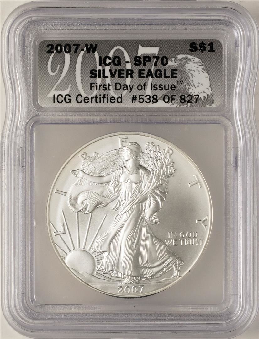 One 2007-W $1 American Silver Eagle Coin ICG SP70 First Day of Issue. ICG Certified.