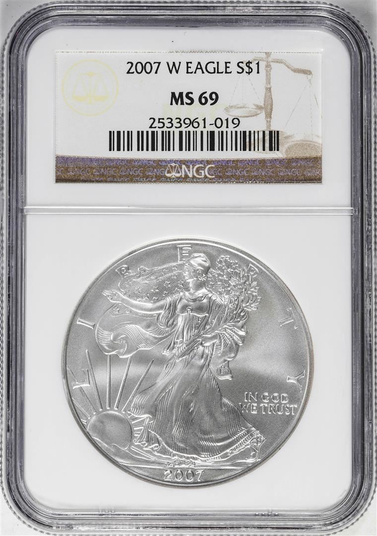 One 2007-W $1 Burnished American Silver Eagle Coin NGC MS69. NGC Certified.