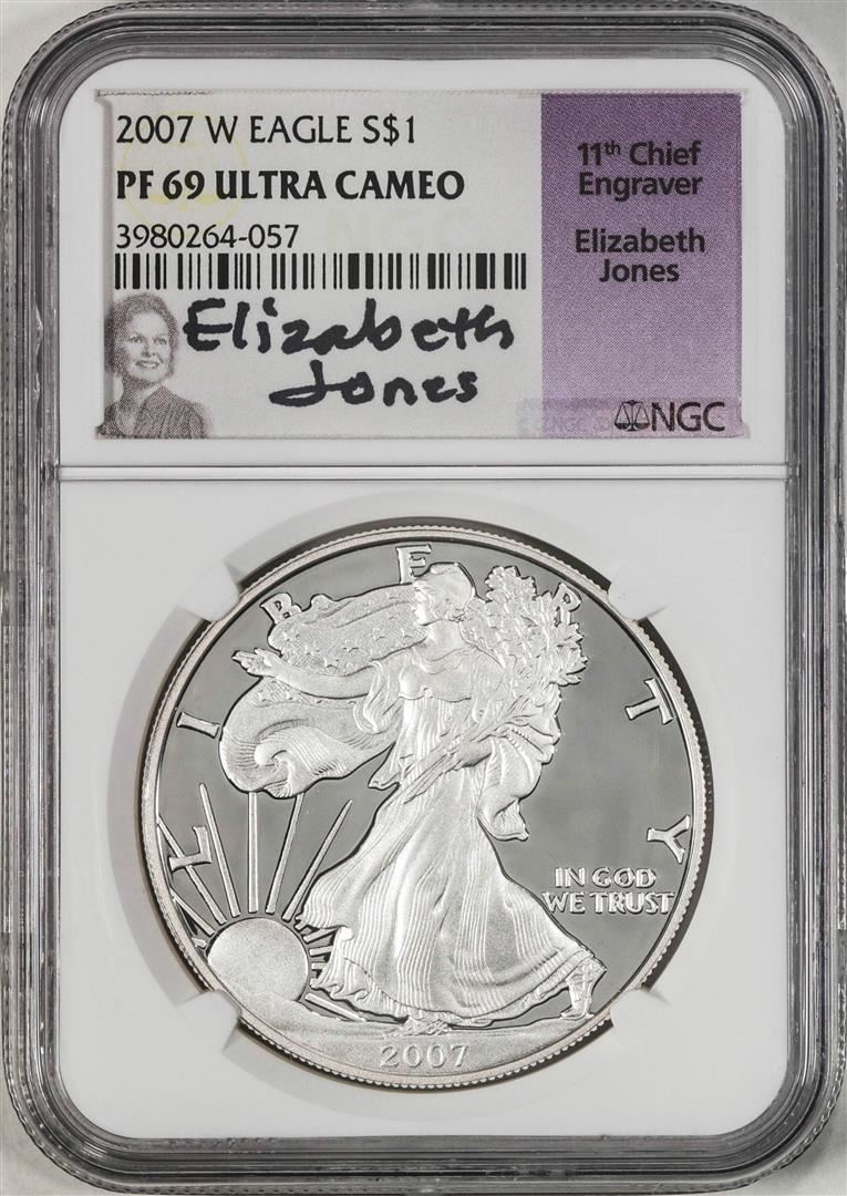 One 2007-W $1 Proof American Silver Eagle Coin NGC PF69 Ultra Cameo Elizabeth Jones Signature. NGC Certified.