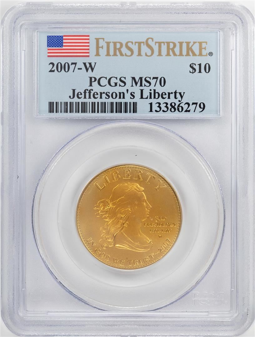 One 2007-W $10 Jefferson's Liberty Commemorative Gold Coin PCGS MS70 First Strike. PCGS Graded.