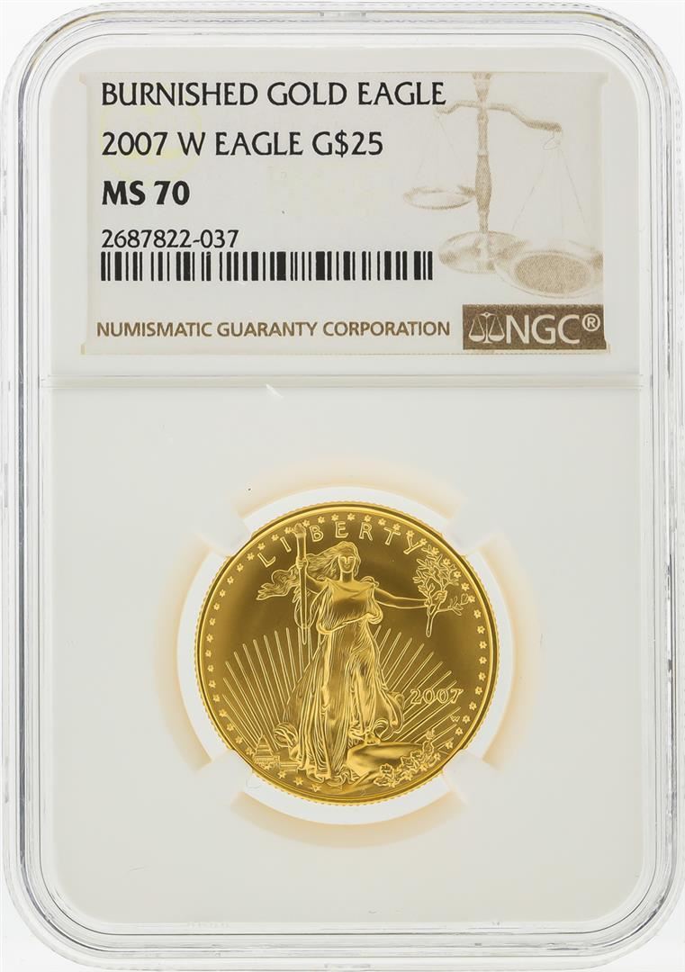 One 2007-W $25 Burnished American Gold Eagle Coin NGC MS70. NGC Certified.