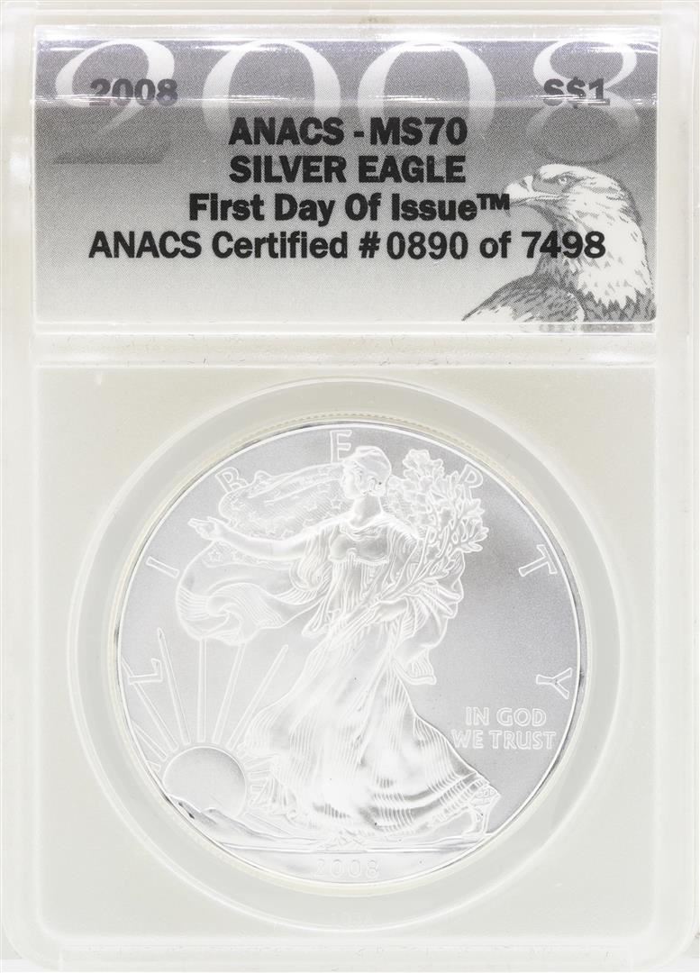 One 2008 $1 American Silver Eagle Coin ANACS MS70. ANACS Certified.