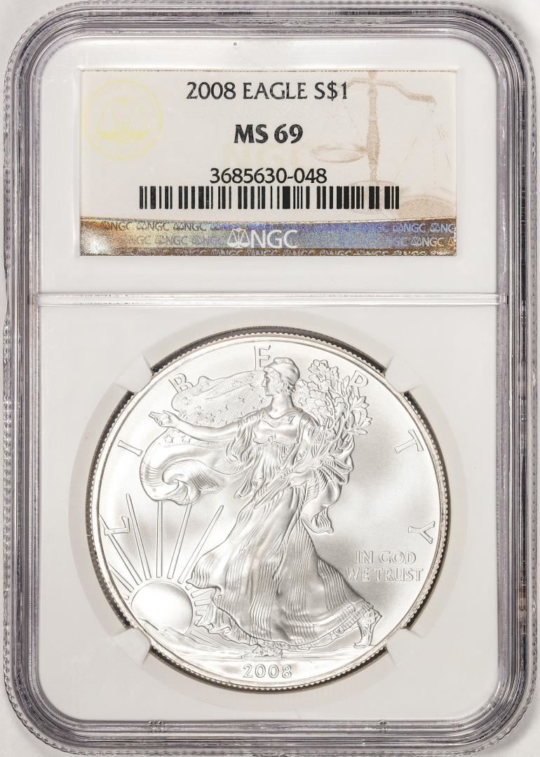 One 2008 $1 American Silver Eagle Coin NGC MS69. NGC Certified.