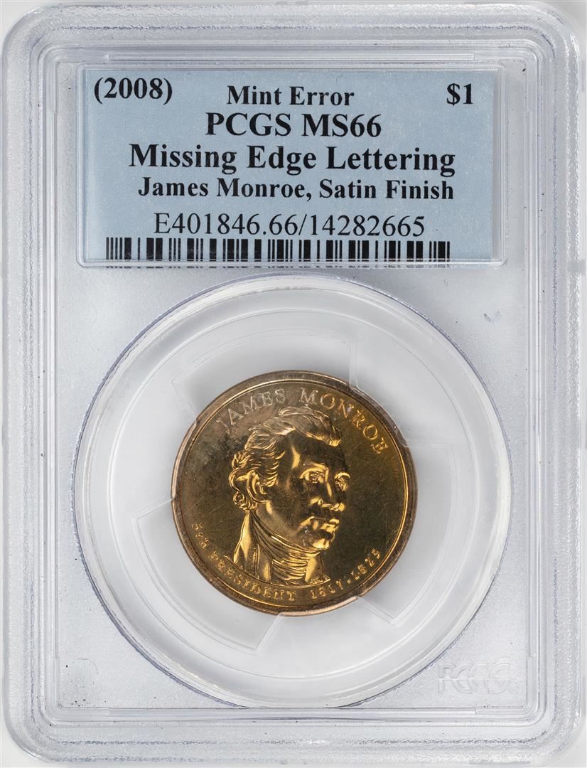 One 2008 $1 Monroe Presidential Coin Missing Edge Lettering Error PCGS MS66 Satin Finish. PCGS Graded.