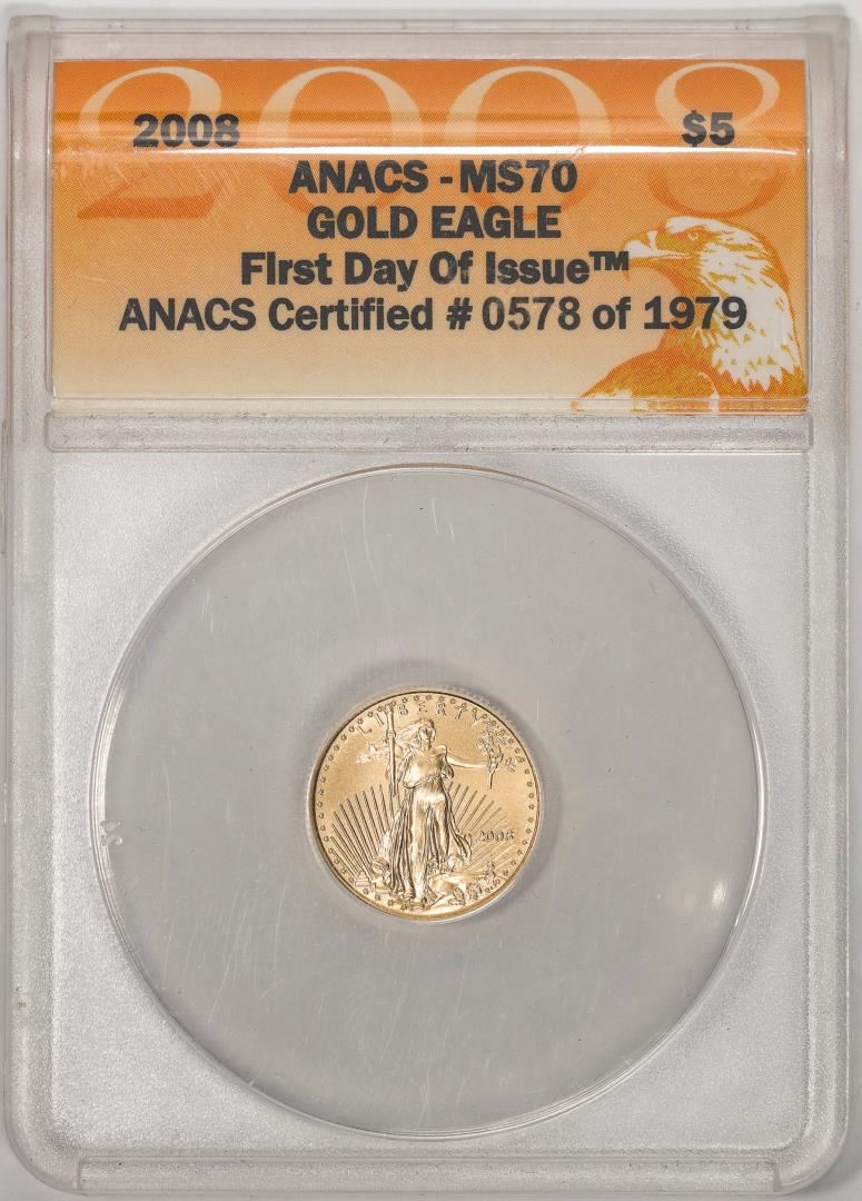 One 2008 $5 American Gold Eagle Coin ANACS MS70 First Day of Issue. ANACS Certified.