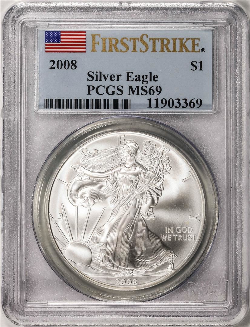 One 2008 American Silver Eagle Coin PCGS MS69 First Strike. PCGS Graded.