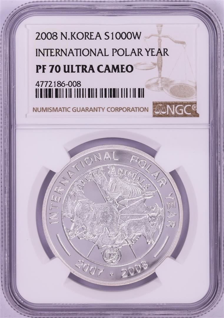 One 2008 Proof N. Korea 1000 Won International Polar Year Silver Coin NGC PF70 Ultra Cameo. NGC Certified.