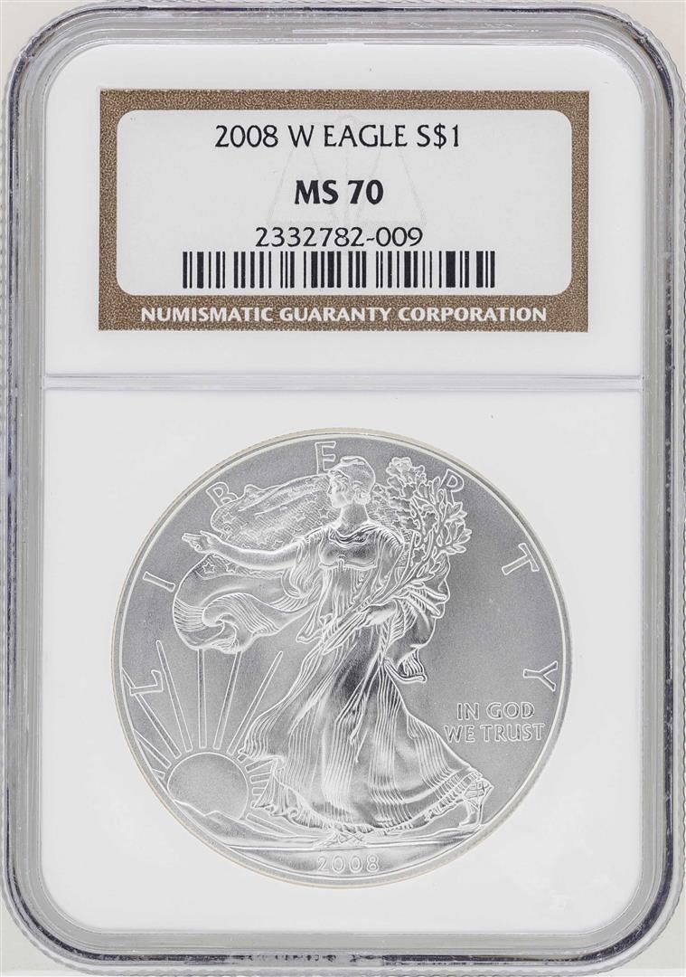 One 2008-W $1 American Silver Eagle Coin NGC MS70. NGC Certified.