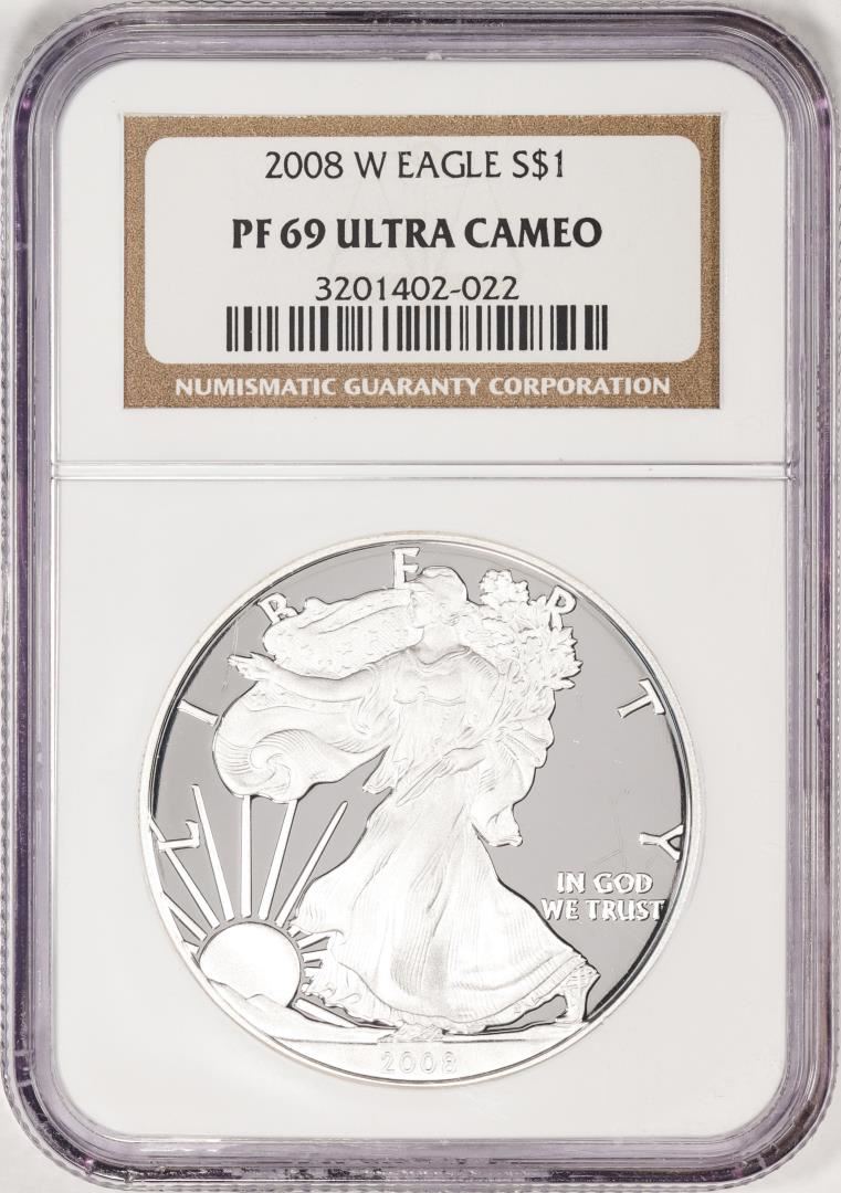 One 2008-W $1 Proof American Silver Eagle Coin NGC PF69 Ultra Cameo. NGC Certified.