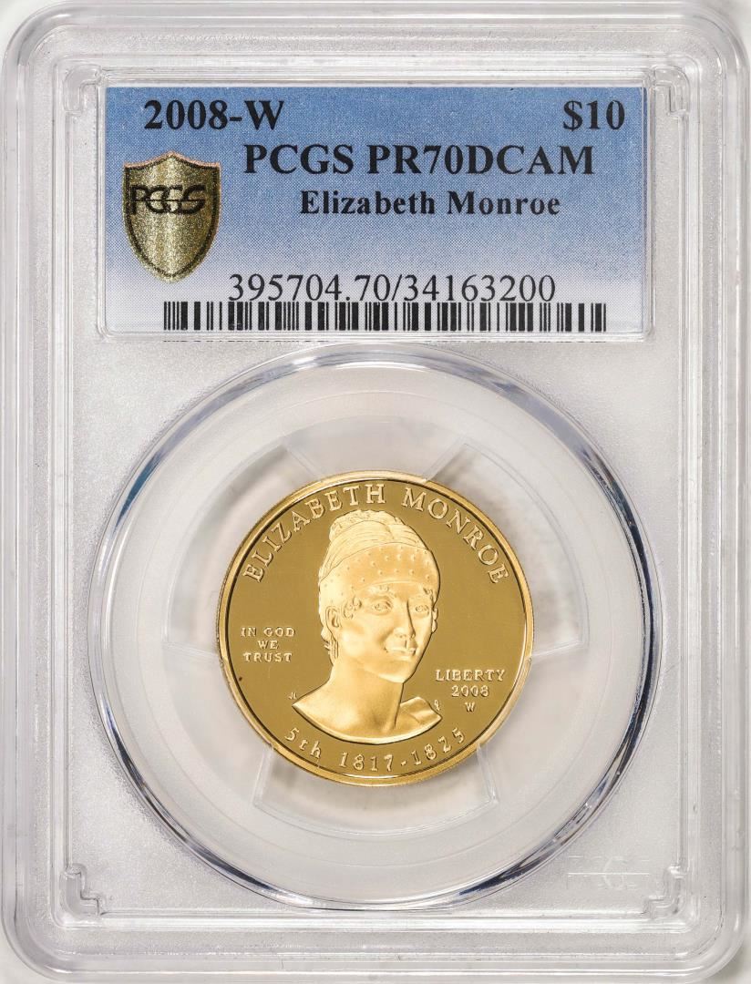One 2008-W $10 Proof Elizabeth Monroe Gold Coin PCGS PR70DCAM. PCGS Graded.