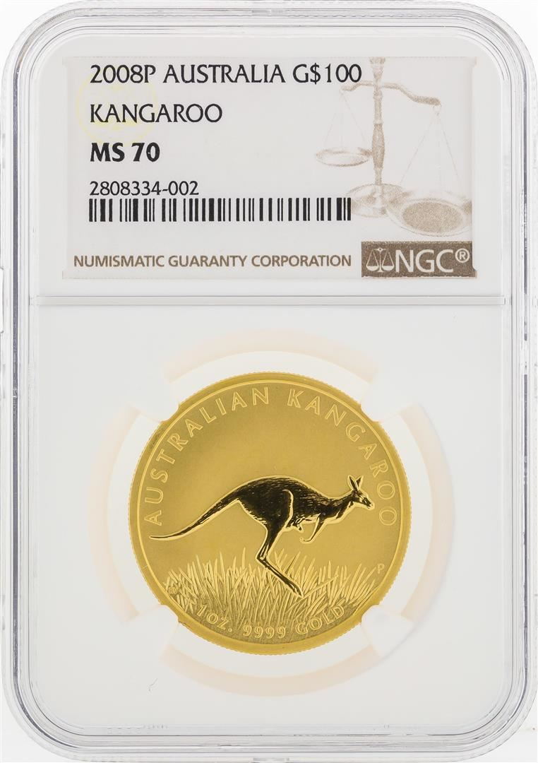 One 2008P $100 Australia Kangaroo Gold Coin NGC MS70. NGC Certified.