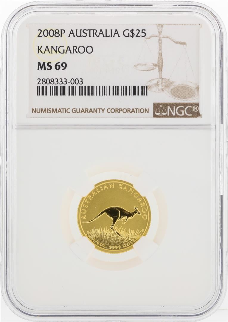 One 2008P $25 Australia Kangaroo Gold Coin NGC MS69. NGC Certified.
