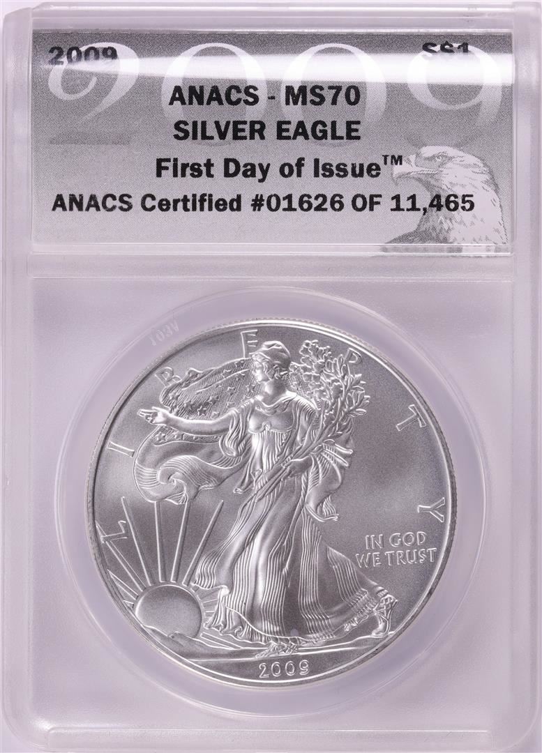 One 2009 $1 American Silver Eagle Coin ANACS MS70. ANACS Certified.