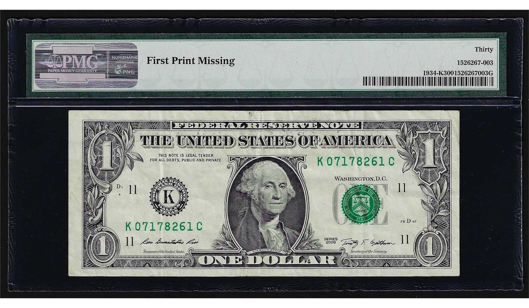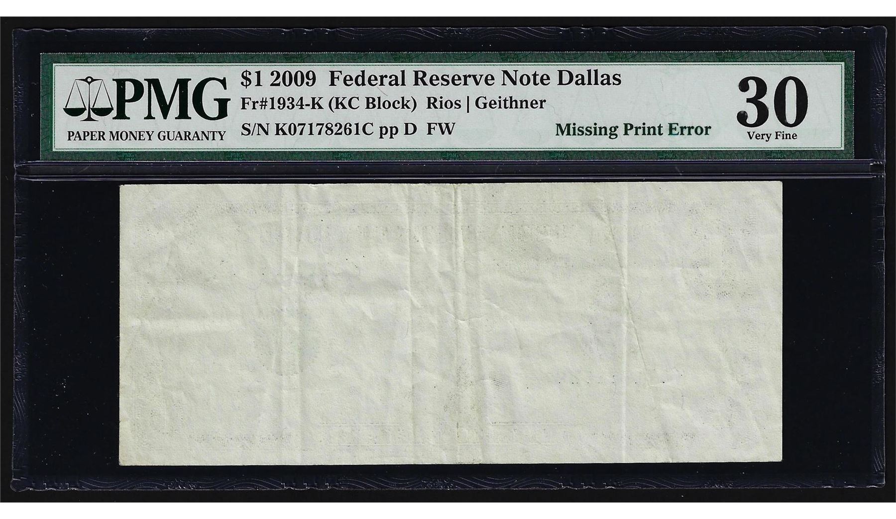One 2009 $1 Federal Reserve Note Dallas Missing Print ERROR PMG Very Fine 30. PMG Certified.