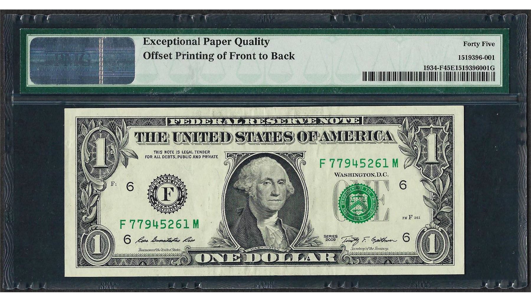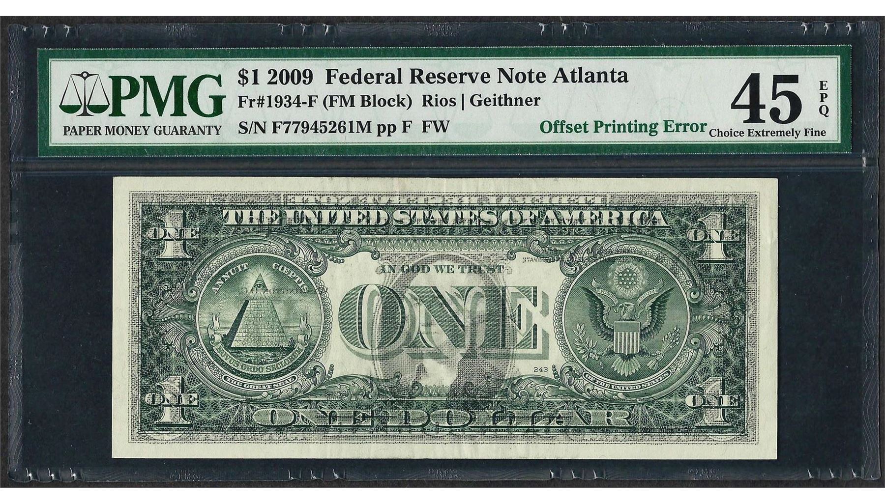 One 2009 $1 Federal Reserve Note ERROR Offset Printing PMG Choice Extremely Fine 45EPQ. PMG Certified.