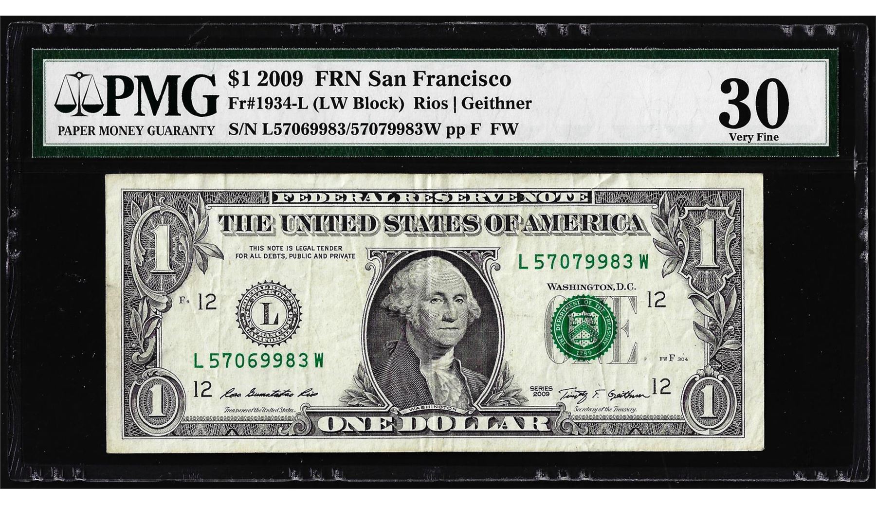 One 2009 $1 Federal Reserve Note Mismatched Serial Number Error Fr.1934-L PMG Very Fine 30. PMG Certified.