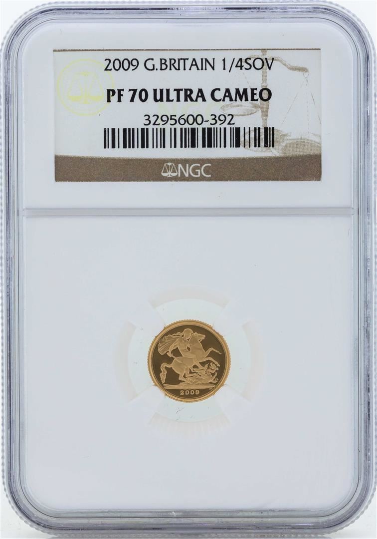 One 2009 Great Britain 1/4 Sovereign Proof Gold Coin NGC PF70 Ultra Cameo. NGC Certified.