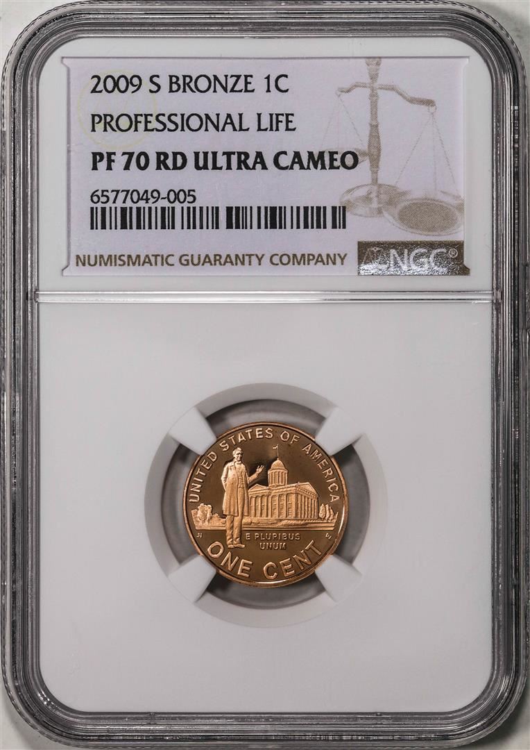 One 2009-S Bronze Professional Life Lincoln Cent Coin NGC PF70RD Ultra Cameo. NGC Certified.