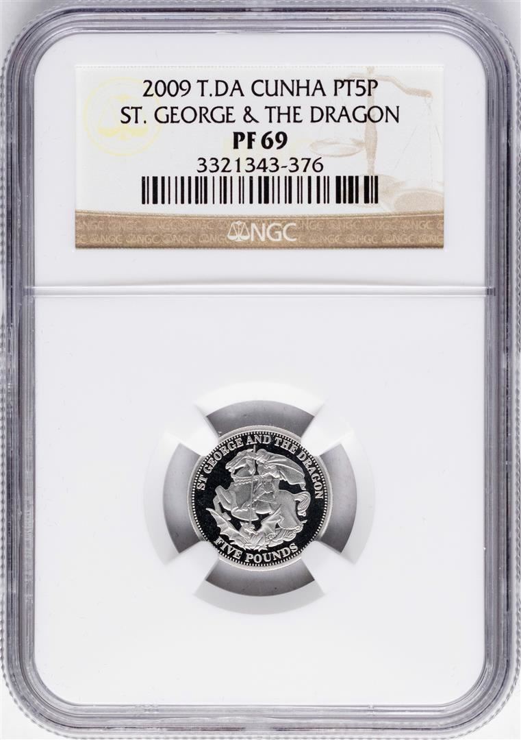 One 2009 T.DA Cunha 5 Pounds 1/10 oz St. George & Dragon Platinum Coin NGC PF69. NGC Certified.
