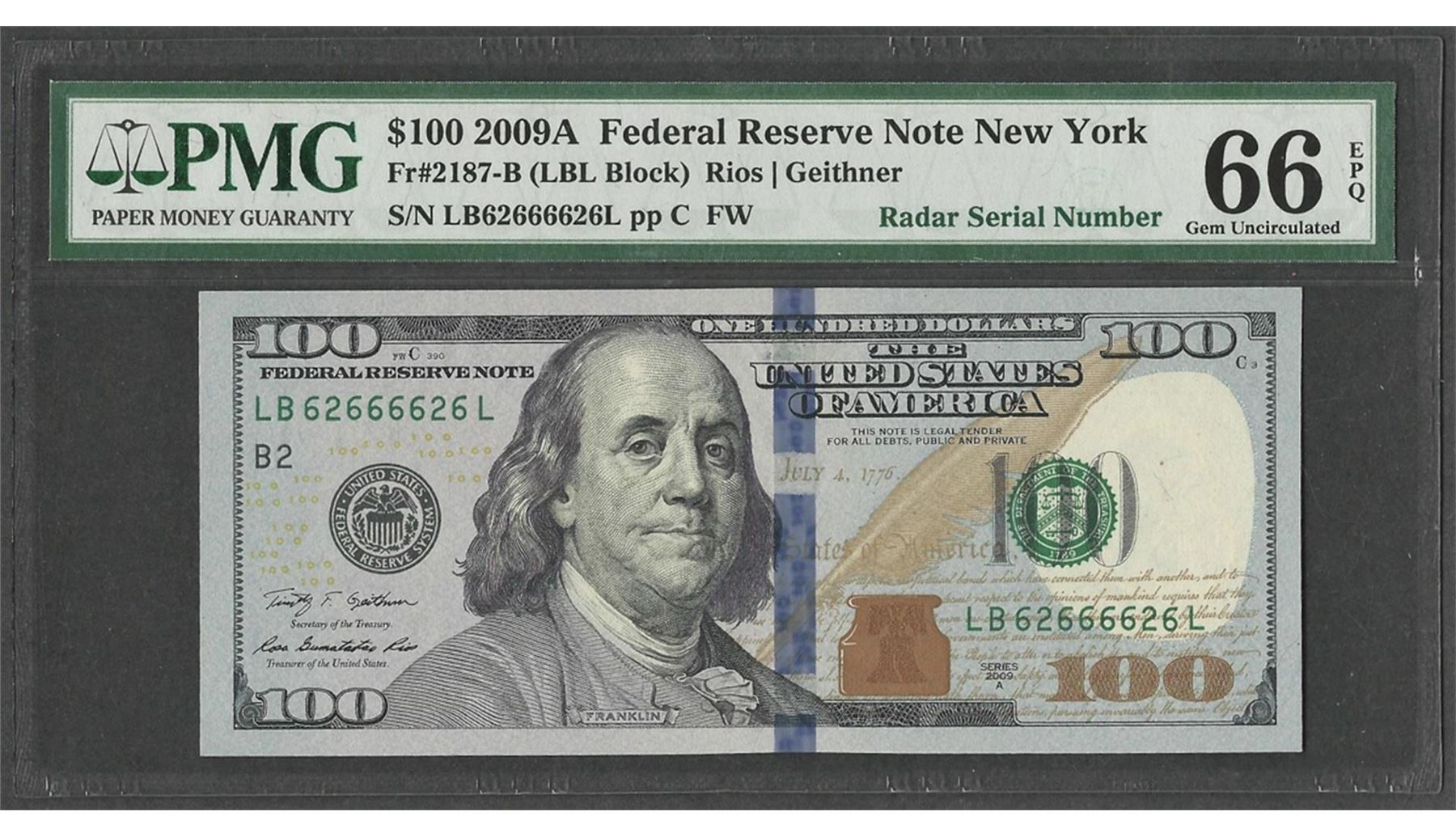 One 2009A $100 Federal Reserve Note Radar Serial Number PMG Gem Uncirculated 66EPQ. PMG Certified.
