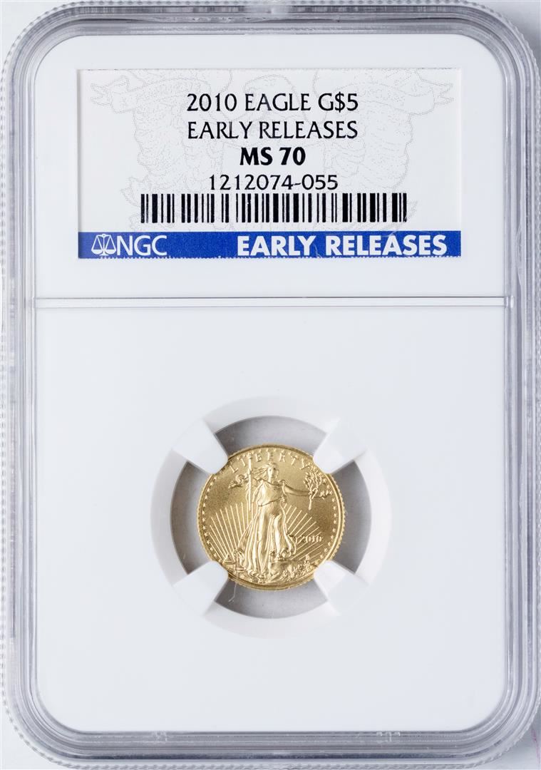 One 2010 $5 American Gold Eagle Coin NGC MS70 Early Releases. NGC Certified.