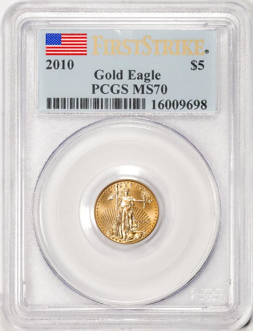 One 2010 $5 American Gold Eagle Coin PCGS MS70 First Strike. PCGS Graded.