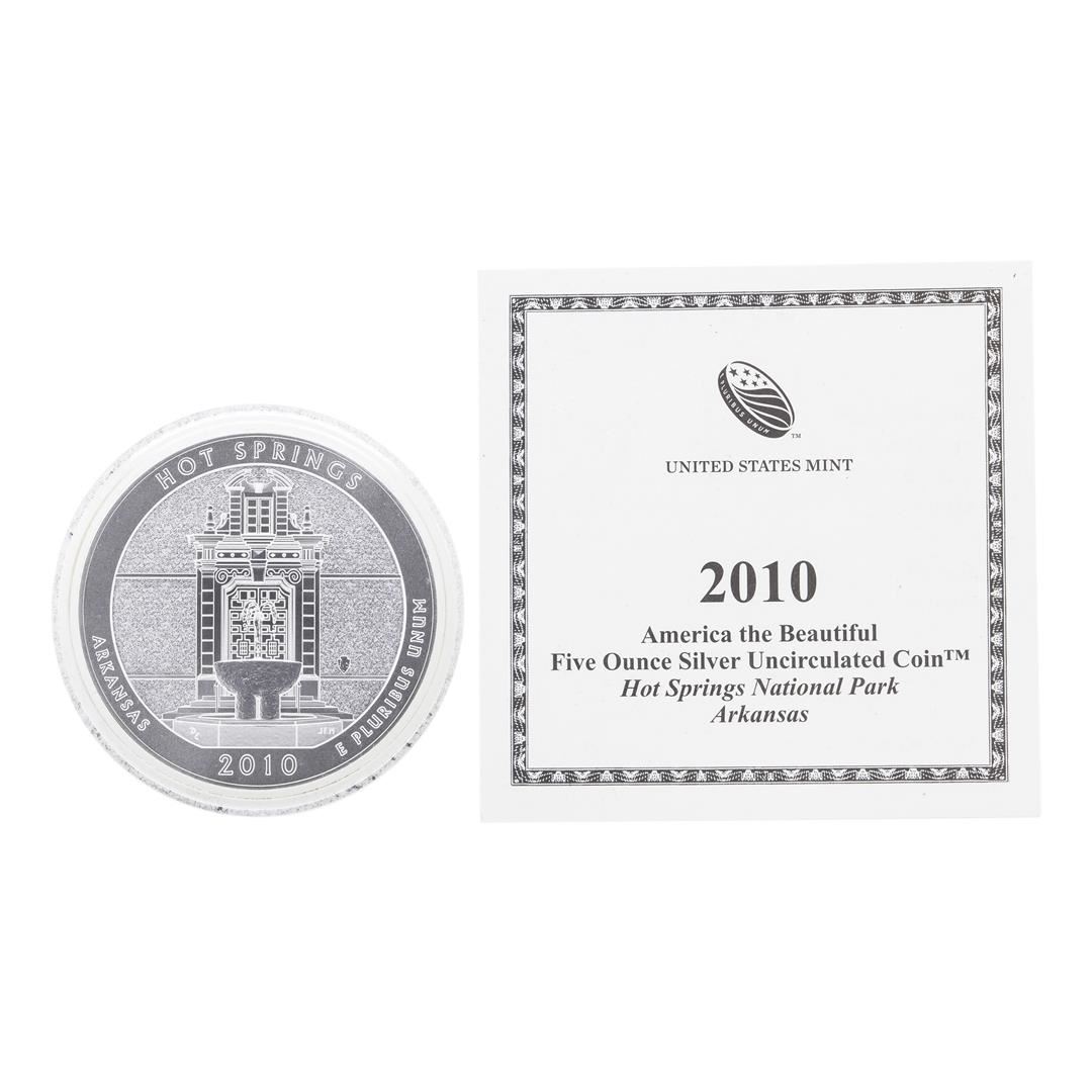 One 2010 America the Beautiful Hot Springs 5 oz. Silver Coin.