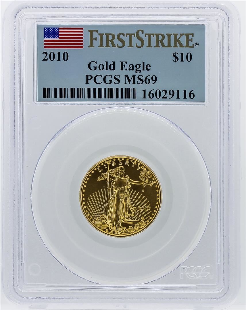 One 2010 First Strike $10 American Eagle Gold Coin PCGS MS69. PCGS Certified.