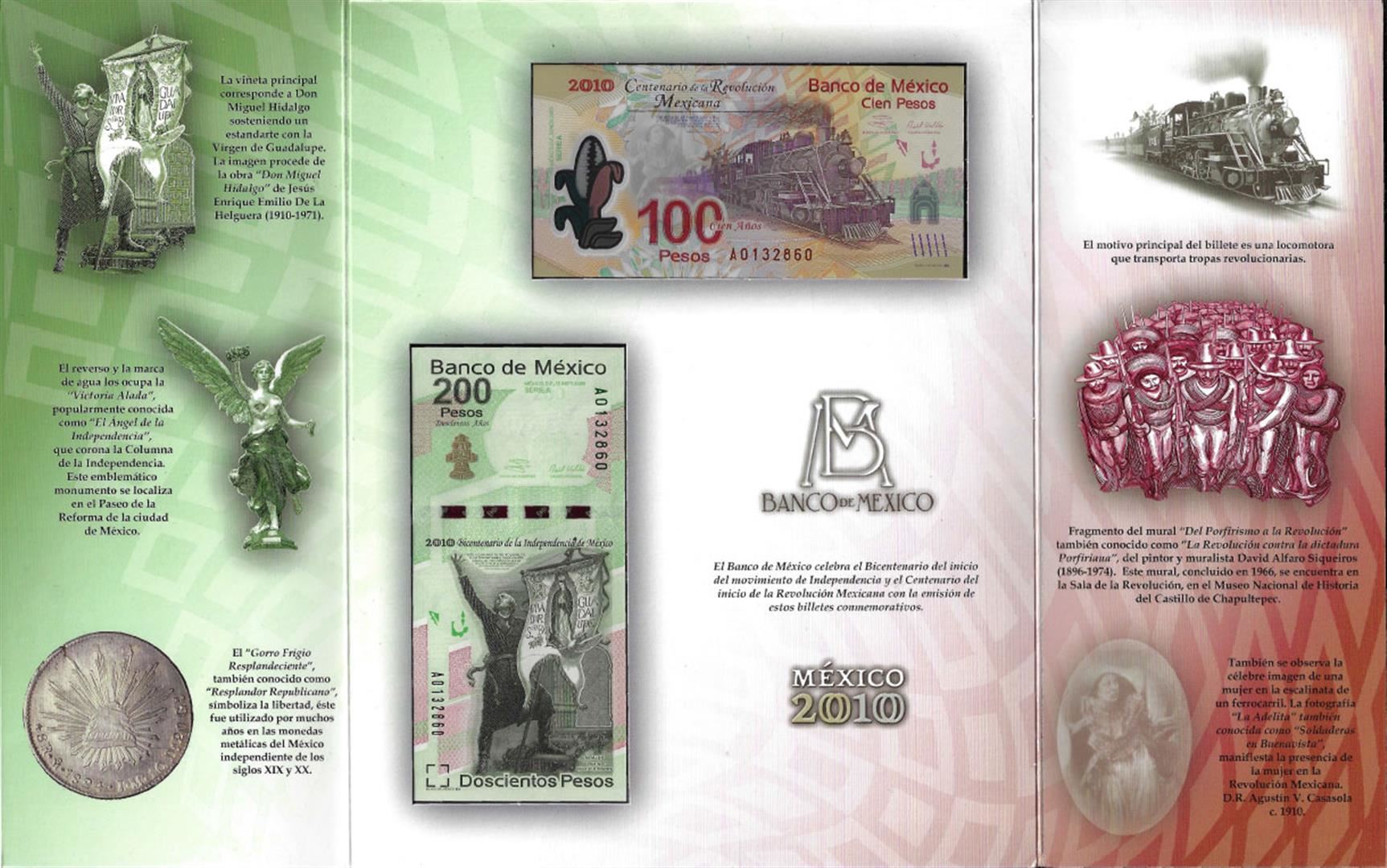 2010 Mexico 100 & 200 Pesos Commemorative Uncirculated Bank Notes in Folder