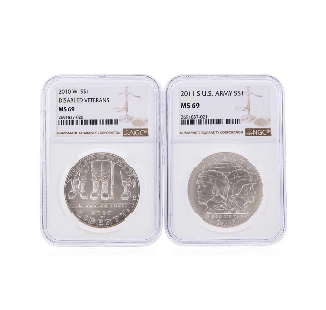 2010-W $1 Disabled Veterans and 2011-S $1 U.S. Army Silver Coins NGC MS69