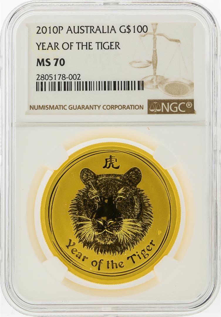 One 2010P $100 Australia Lunar Year of the Tiger Gold Coin NGC MS70. NGC Certified.