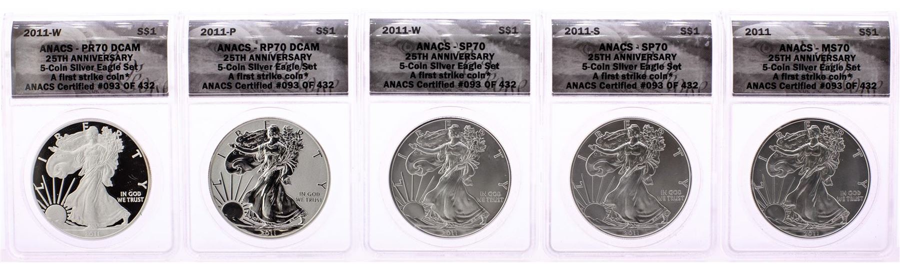 One 2011 $1 American Silver Eagle 25th Anniversary (5) Coin Set ANACS MS70/PR70. ANACS Certified.