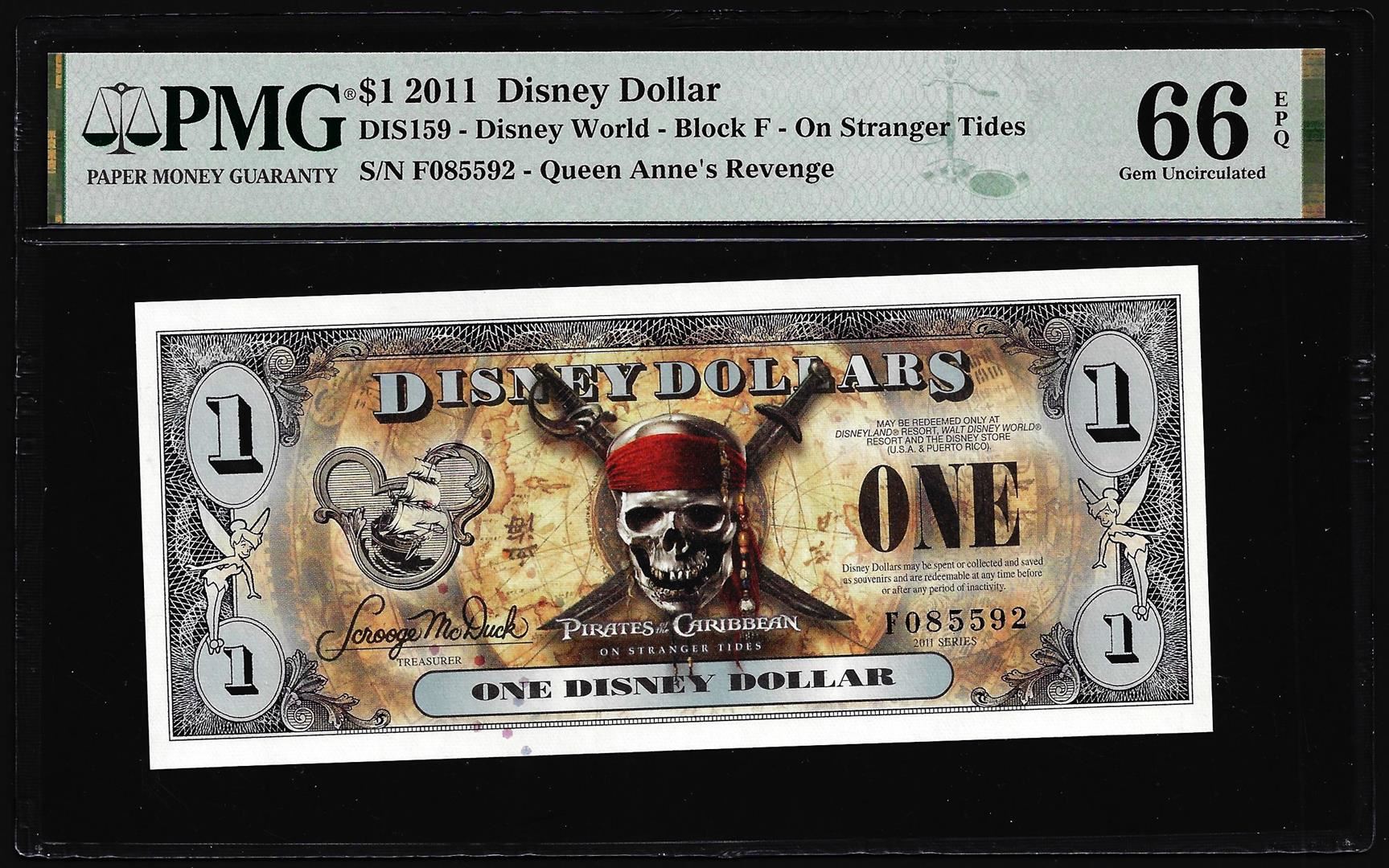 One 2011 $1 Disney Pirates of Caribbean On Stranger Tides Note PMG Gem Uncirculated 66EPQ. PMG Certified.