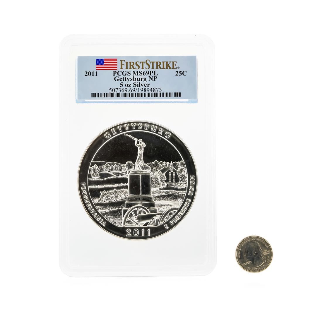 One 2011 America the Beautiful 5oz Silver Coin Gettysburg PCGS MS69PL. PCGS Graded.