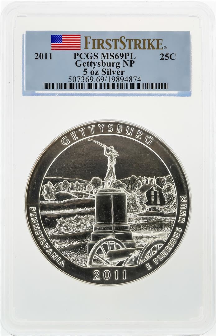 One 2011 America the Beautiful 5oz Silver Coin Gettysburg PCGS MS69PL. PCGS Graded.