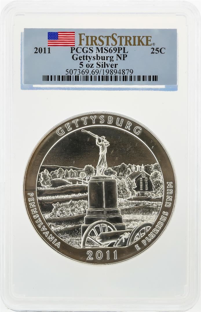 One 2011 America the Beautiful 5oz Silver Coin Gettysburg PCGS MS69PL. PCGS Graded.
