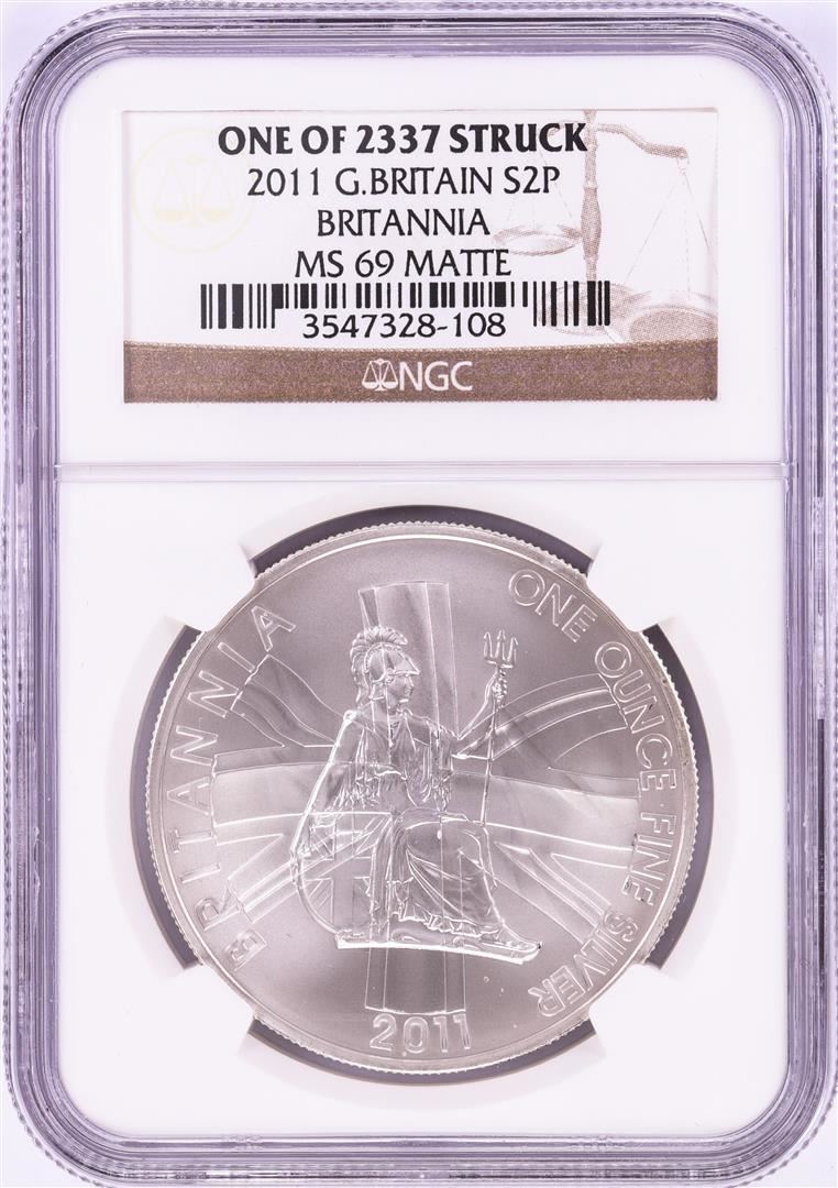 One 2011 Great Britain 2 Pounds Silver Coin NGC MS69 Matte. NGC Certified.