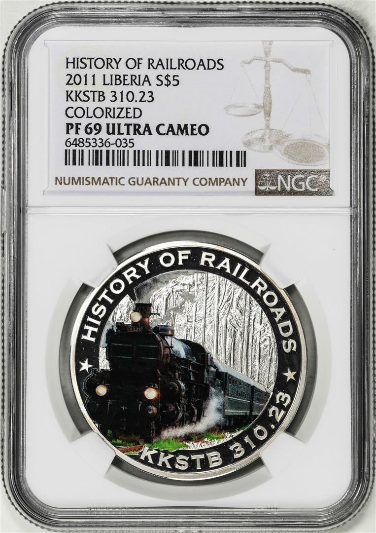 One 2011 Liberia $5 History of Railroads KKSTB 310.23 Silver Coin NGC PF69 Ultra Cameo. NGC Certified.