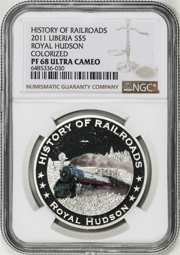 One 2011 Liberia $5 History of Railroads Royal Hudson Silver Coin NGC PF68 Ultra Cameo. NGC Certified.