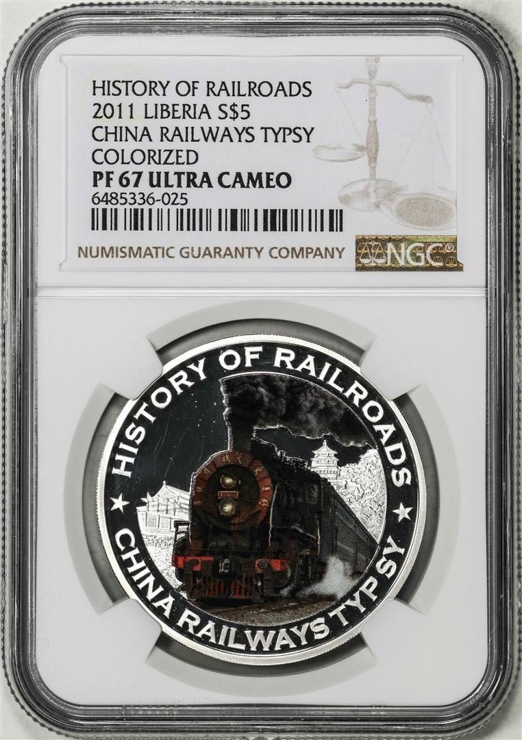 One 2011 Liberia $5 Proof China Railways Typsy History Silver Coin NGC PF67 Ultra Cameo. NGC Certified.