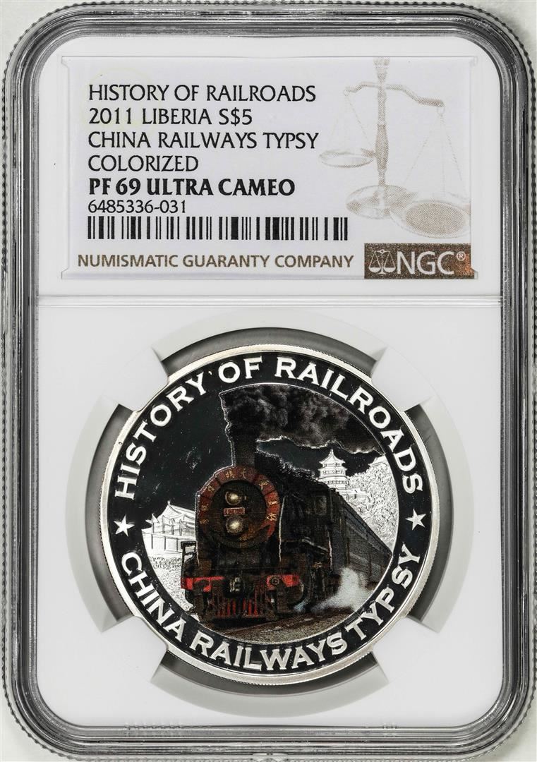 One 2011 Liberia $5 Proof China Railways Typsy History Silver Coin NGC PF69 Ultra Cameo. NGC Certified.