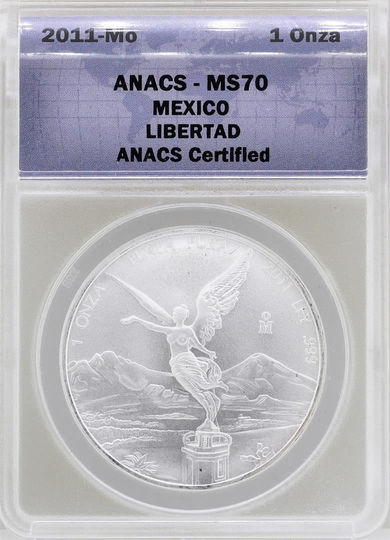 One 2011-Mo Mexico Libertad Silver Coin ANACS MS70. ANACS Certified.