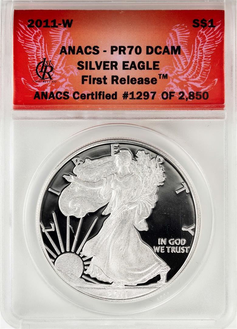 One 2011-W $1 Proof American Silver Eagle Coin ANACS PR70 DCAM First Release. ANACS Certified.
