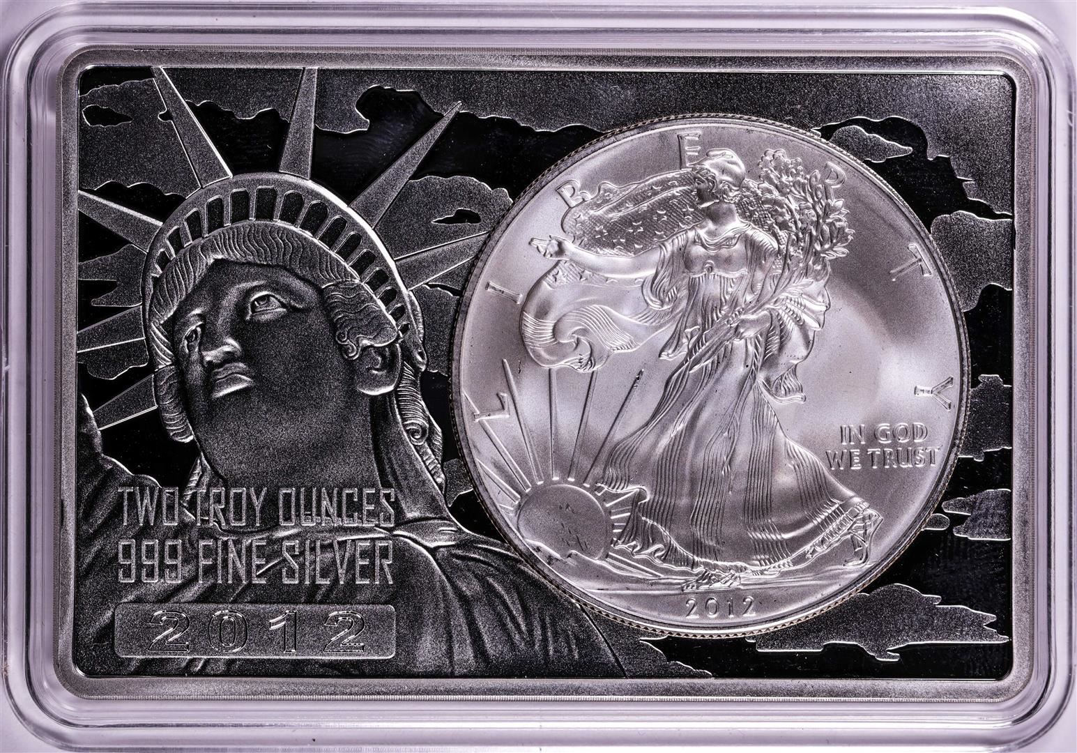 One 2012 $1 American Silver Eagle Coin & 2oz Silver Bar Set.