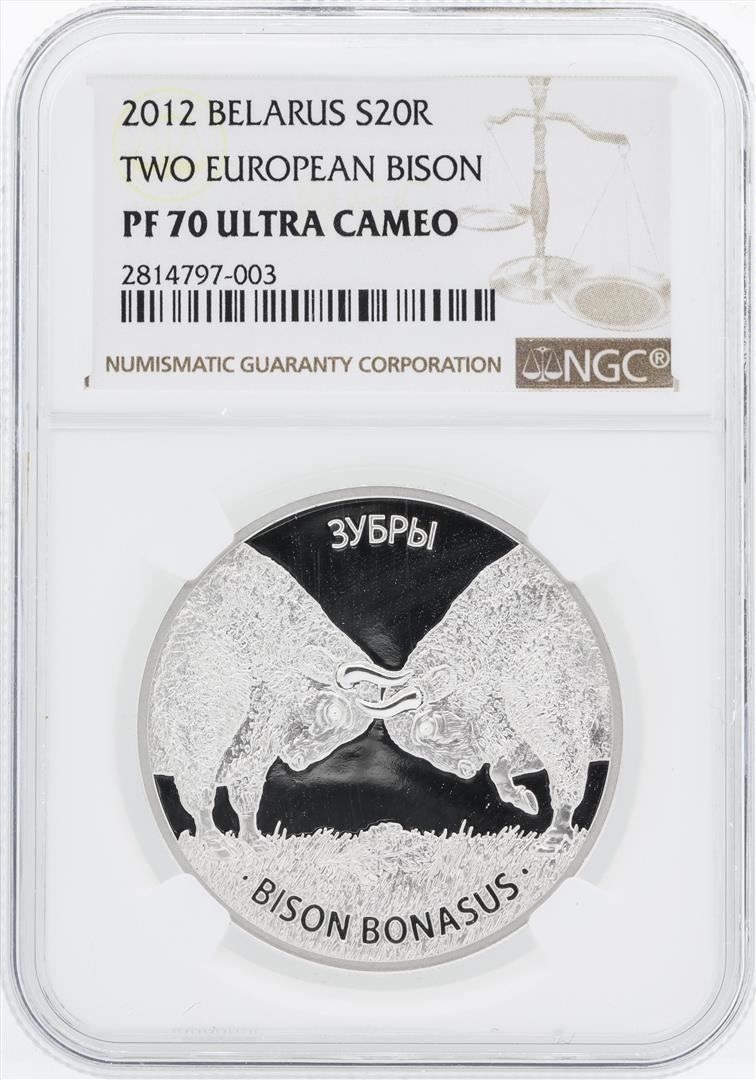 One 2012 Belarus 20 Roubles Two European Bison Silver Coin NGC PF70 Ultra Cameo.