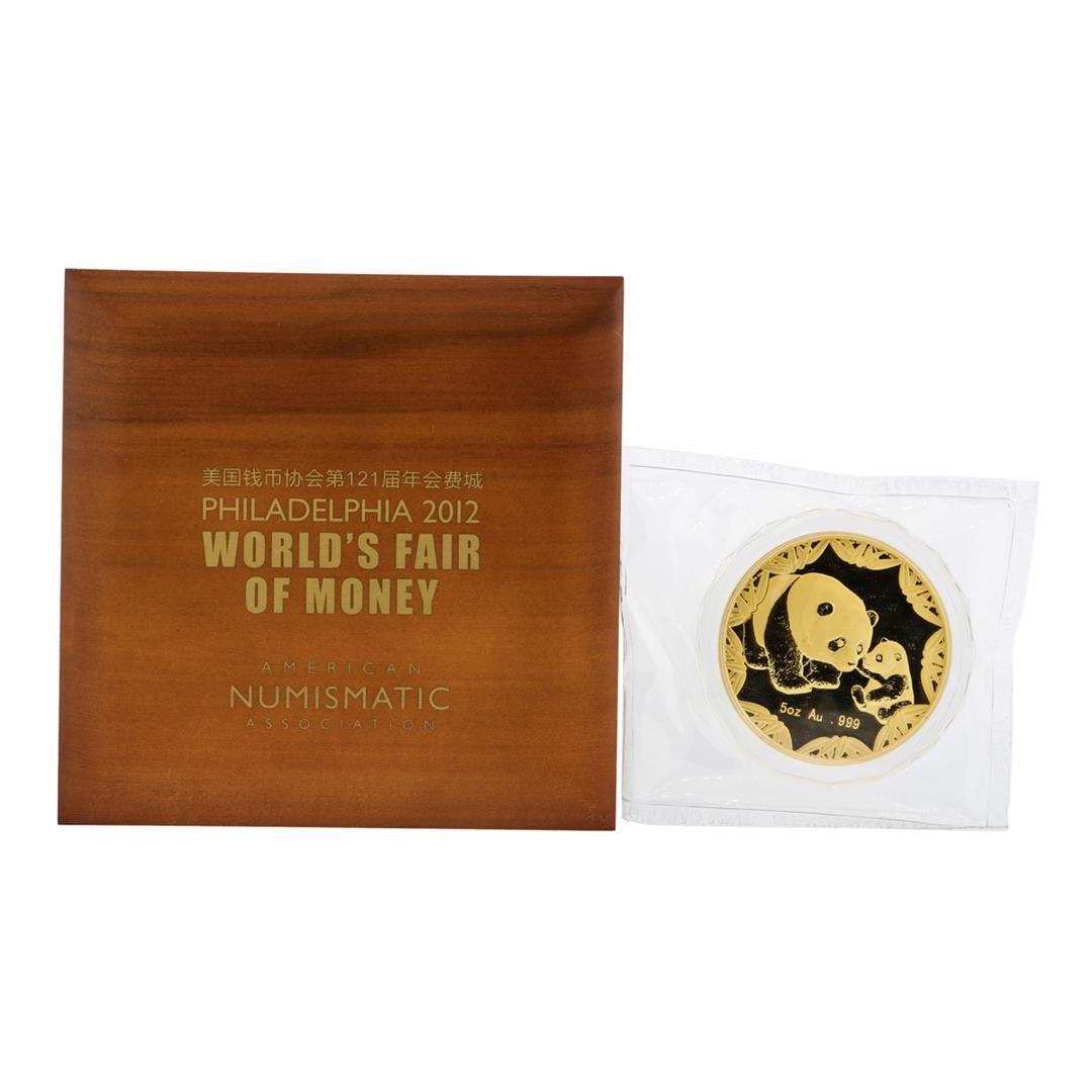 2012 China 5oz Philadelphia World's Fair of Money Panda Gold Medal Gem Cameo Proof, an extremely rare offering with a tiny mintage of just 99 pieces, this massive medal displays a glittering image of a mother and baby panda set against deep, shimmering, m