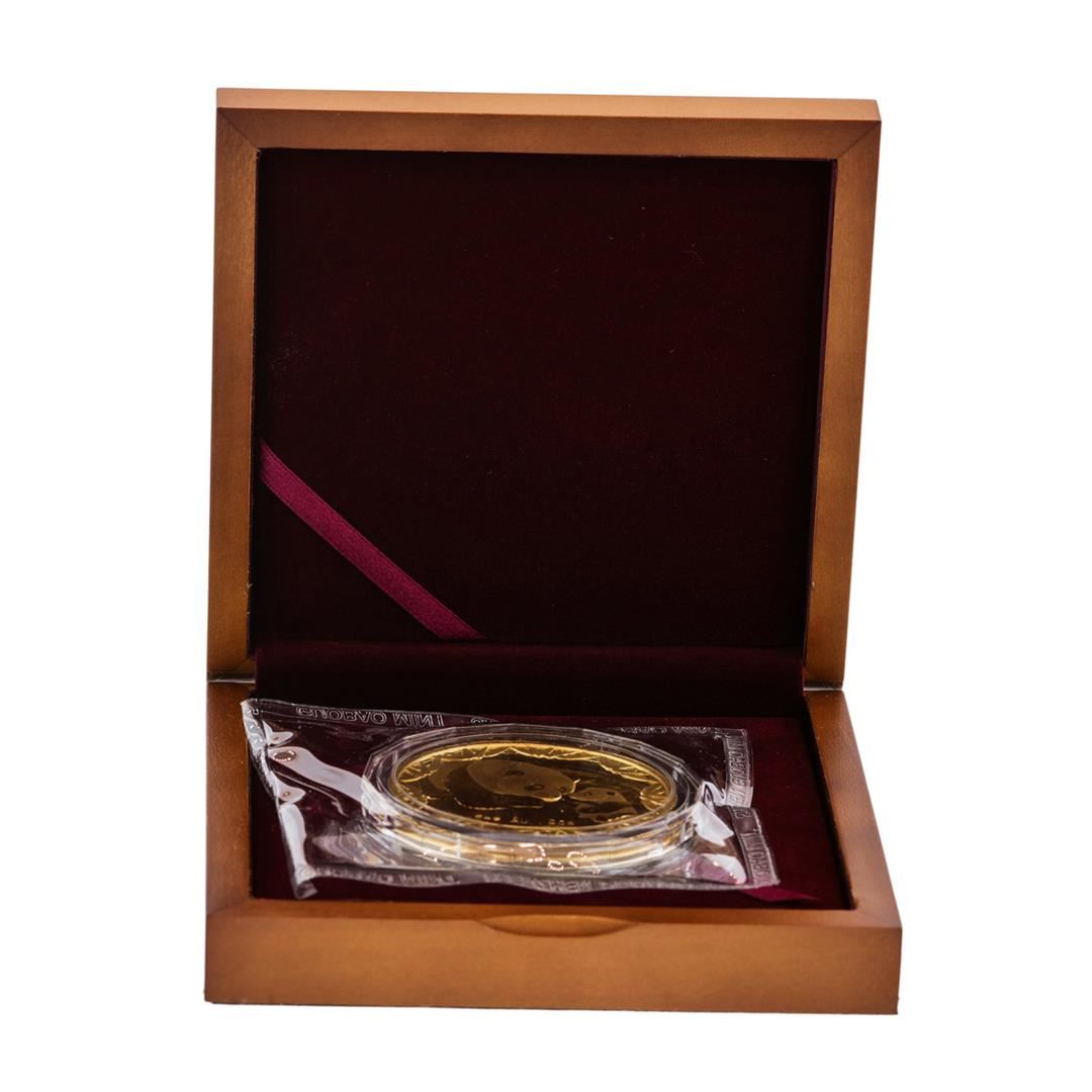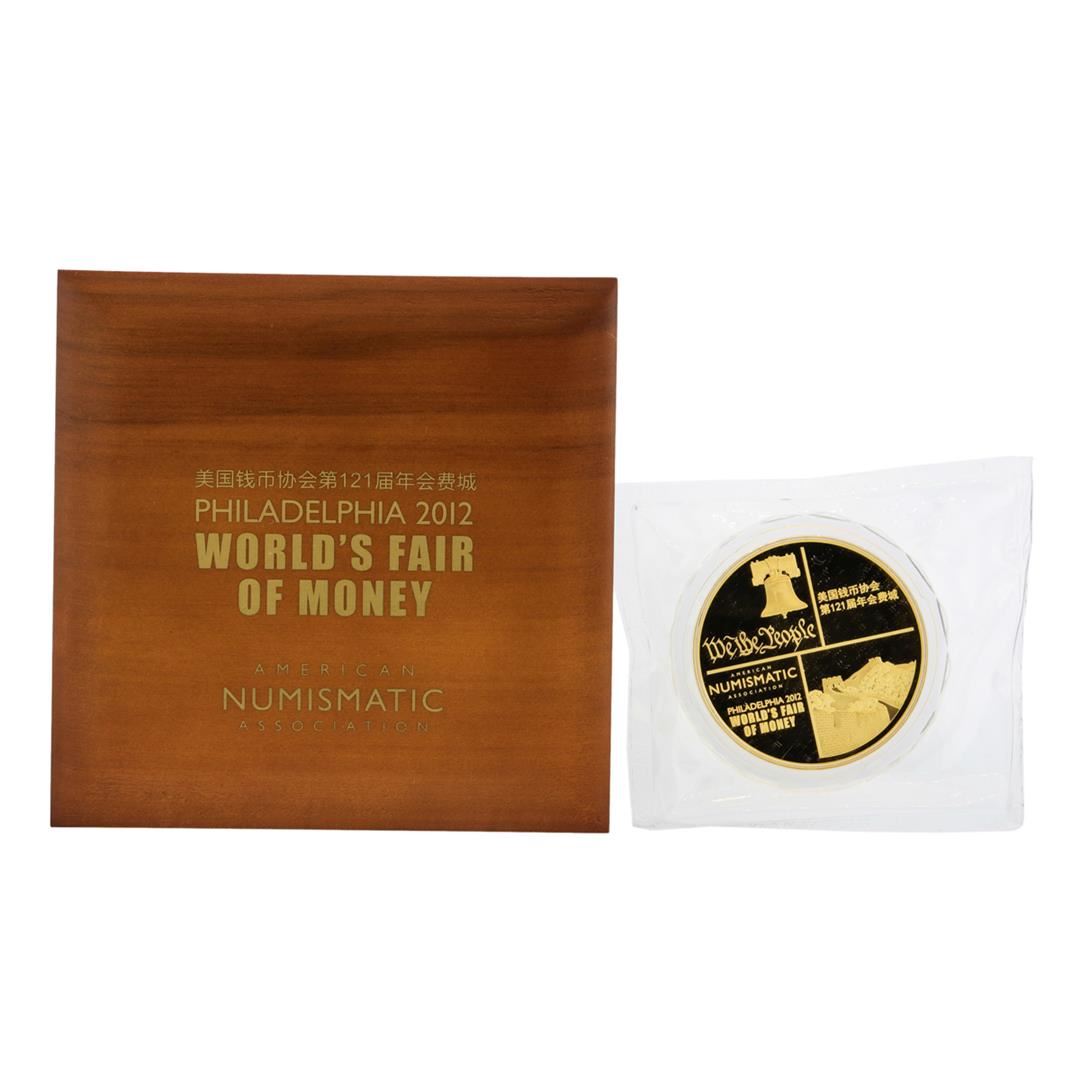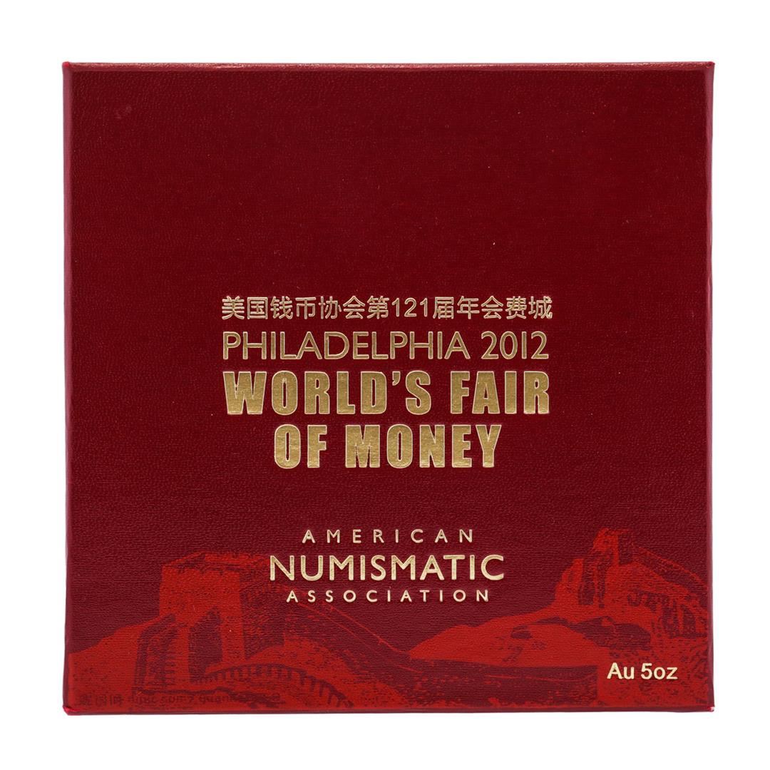 2012 China 5oz Philadelphia World's Fair of Money Panda Gold Medal Gem Cameo Proof, an extremely rare offering with a tiny mintage of just 99 pieces, this massive medal displays a glittering image of a mother and baby panda set against deep, shimmering, mirror-like fields. This piece comes in the original mint vinyl and housed in the wooden case of issue together with COA #84, attesting to its rarity and desirability. A specimen sure to inspire spirited bidding from seekers of perfection.
