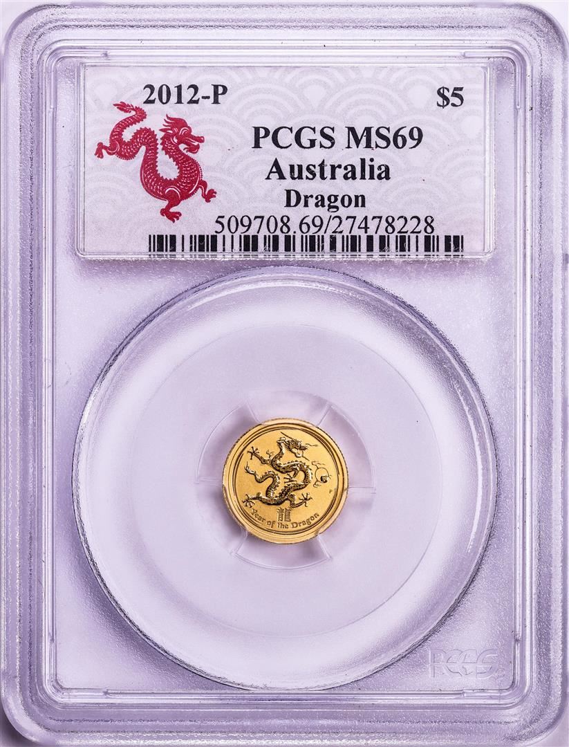 One 2012-P Australia $5 Dragon 1/20oz Gold Coin PCGS MS69. PCGS Graded.