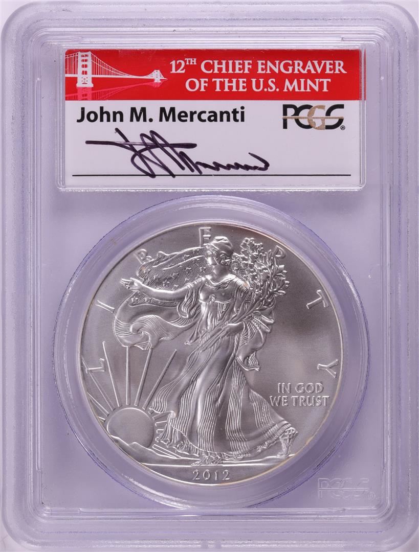 2012-(S) $1 American Silver Eagle Coin PCGS MS70 Mercanti Signed First Strike
